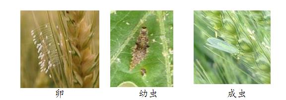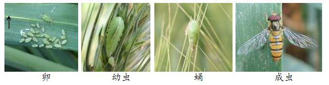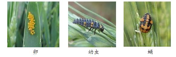 瓢虫:一生经历成虫、卵、幼虫和蛹。成虫半球形,头常嵌入前胸中,有时完全被前胸背板盖住,前胸背板和鞘翅背面光滑,有光泽。卵通常块状,一般为椭圆形或纺锤形,颜色从浅黄色到红黄色。幼虫多灰黑色,身体多刺疣。蛹半球型,多横皱纹。瓢虫是麦蚜的一类重要常见捕食性天敌,成虫和幼虫均能捕食蚜虫,但捕食方式有所差异。