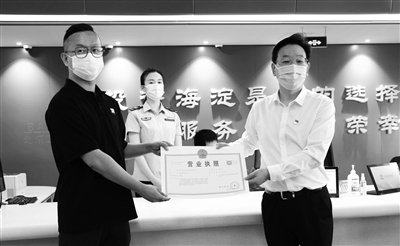 30日,在海淀区政务服务大厅,北京艾纳医学检验实验室有限公司的代表从北京市市场监管局党组书记、局长高念东手中接过了北京市第一张加载“市场主体身份码”(以下简称“企业码”)的营业执照。据了解,这是全国市场监管部门发出的首张加载“企业码”的营业执照。今后,社会公众通过扫描营业执照上的“企业码”,即可查看该企业的执照信息和“一照多址”信息。