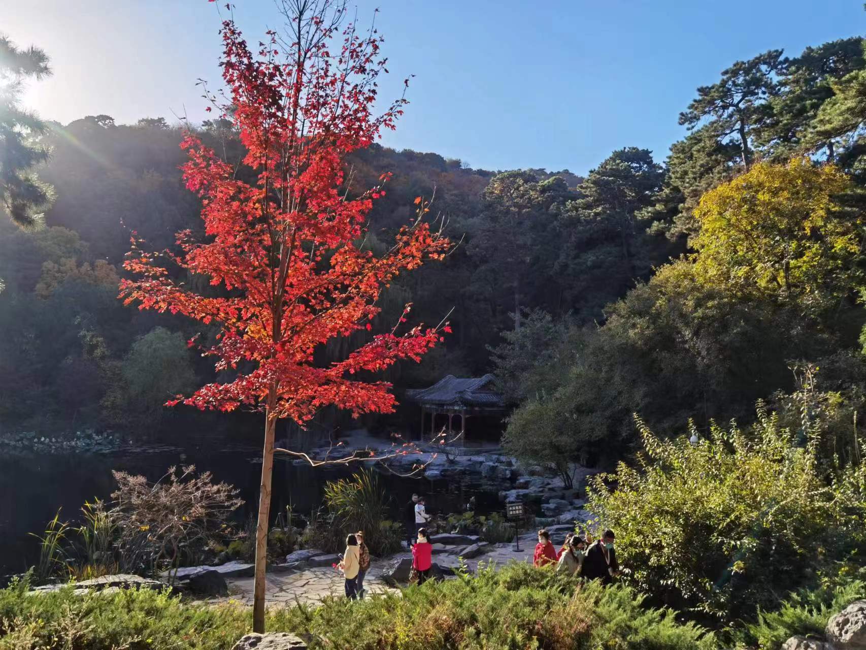 在香山公园里,游客沿着山路向南,便来到了静翠湖旁边。湖畔一棵枫树吸引了所有人的目光。只见它的树冠仿佛被染成血红色,开得如火如荼,极为绚丽夺目。这棵树已经成为香山公园里的新晋网红,游客纷纷在树下打卡拍照。