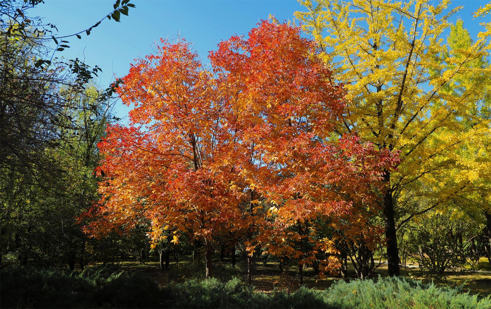 要说赏秋,国家植物园(北园)不能不提。从10月中下旬开始,这里已经变成了一个绚丽多彩的秋日世界。这里不仅有银杏、元宝枫等常见彩叶树种,还有不少新优树种如秋紫白蜡、金叶梣叶槭、花叶梣叶槭、榉树等交相辉映,色彩非常丰富,让人目不暇接、流连忘返。