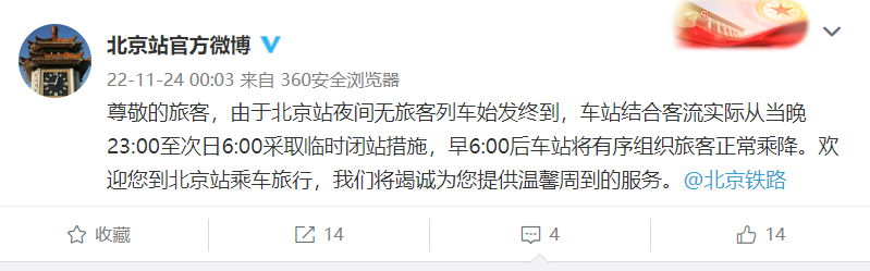 今天(11.24)凌晨,北京站官方微博发布,由于北京站夜间无旅客列车始发终到,车站结合客流实际从当晚23:00至次日6:00采取临时闭站措施,早6:00后车站将有序组织旅客正常乘降。