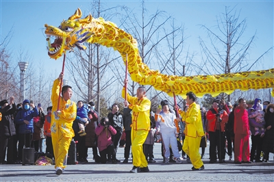 2月19日,北京舞龙协会在念坛公园举行舞龙祈福活动,迎接即将到来的农历二月初二“龙抬头”。现场10支舞龙队为市民带来中华龙、空竹、大刀等传统民俗表演。