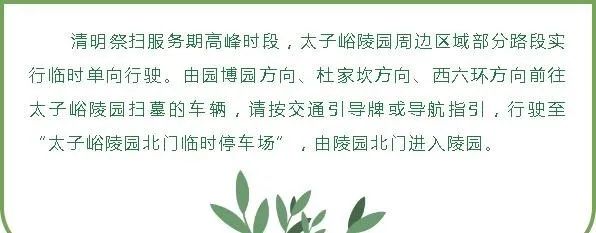 太子峪陵园发布,清明祭扫服务期高峰时段,太子峪陵园周边区域部分路段实行临时单向行驶。由园博园方向、杜家坎方向、西六环方向前往太子峪陵园扫墓的车辆,请按交通引导牌或导航指引,行驶至“太子峪陵园北门临时停车场”,由陵园北门进入陵园。