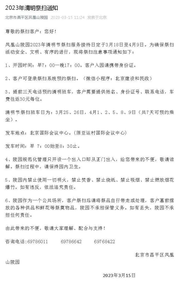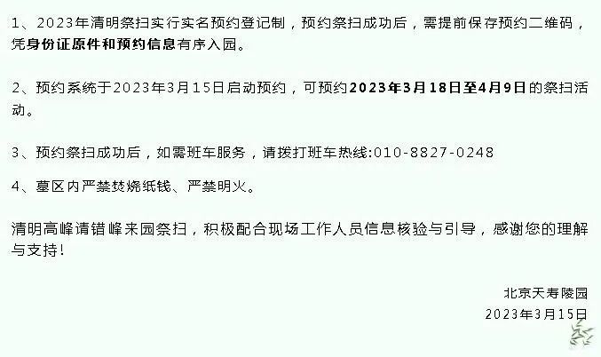 今年祭扫服务集中日为3月18日至4月9日,共23天。