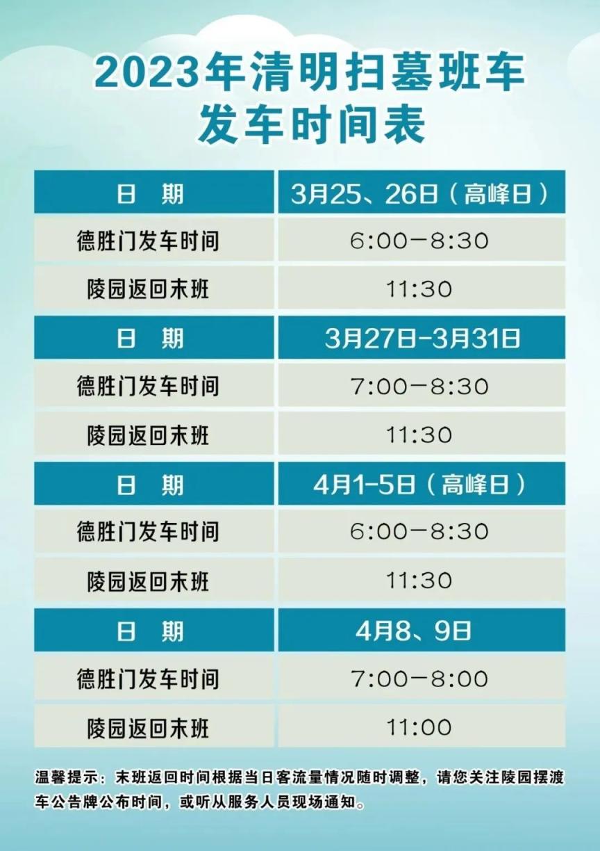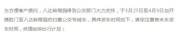 2、3月25日—4月9日期间,德胜门发车时间段之内,不限车次,人满即发,直达八达岭陵园。