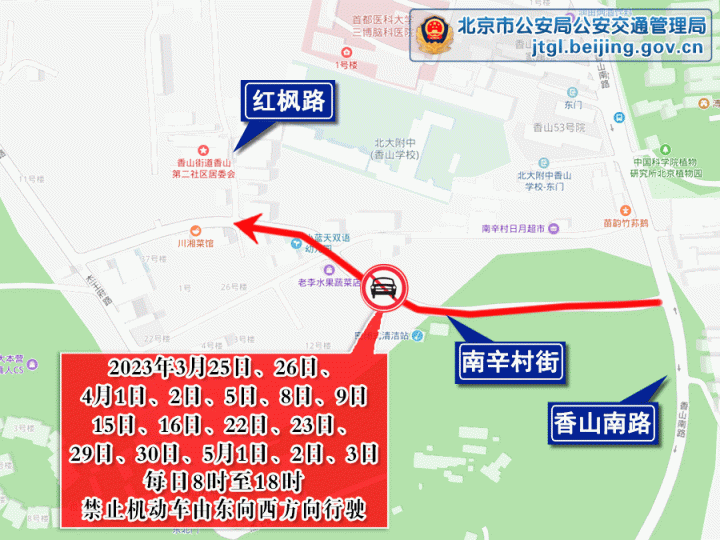 3月25日、26日,4月1日、2日、5日、8日、9日、15日、16日、22日、23日、29日、30日,5月1日、2日、3日,每日8时至18时,海淀区南辛村街(红枫路至香山南路段)禁止机动车由东向西方向行驶。