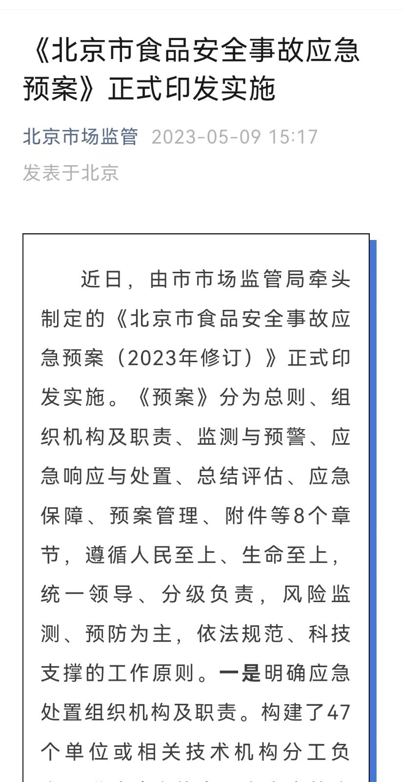 近日,由北京市市场监管局牵头制定的《北京市食品安全事故应急预案(2023年修订)》正式印发实施。