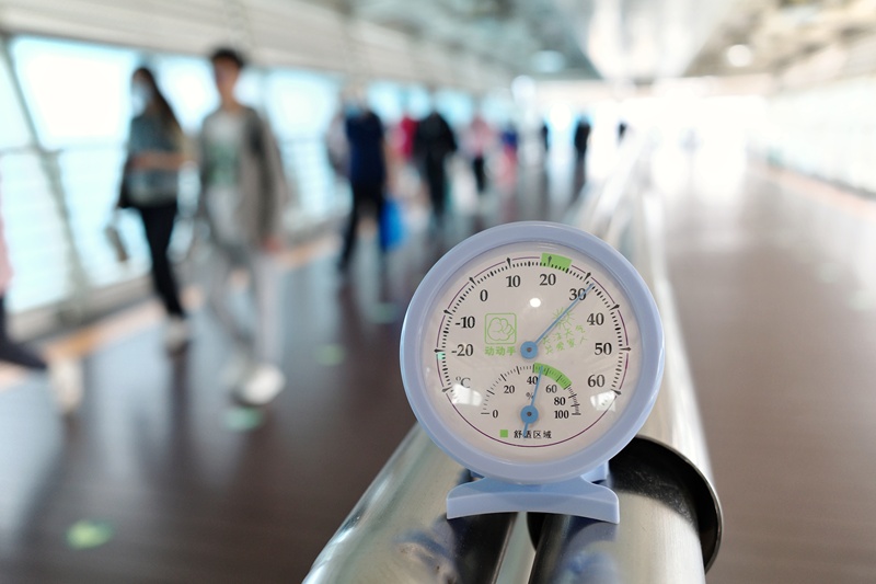 记者注意到,这条连廊有大量的透光玻璃材质,在保证了采光的同时,也聚集了热量,加之连廊内的排风设备也并未开启,导致升温十分明显。步行通过连廊后,温度计的读数就从30摄氏度升至接近35摄氏度,体感十分闷热,不一会儿额头上就渗出了很多汗。