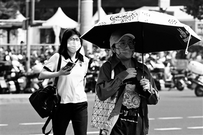 北京近日迎来高温天气,市民撑着遮阳伞出行 摄影/本报记者 李娜