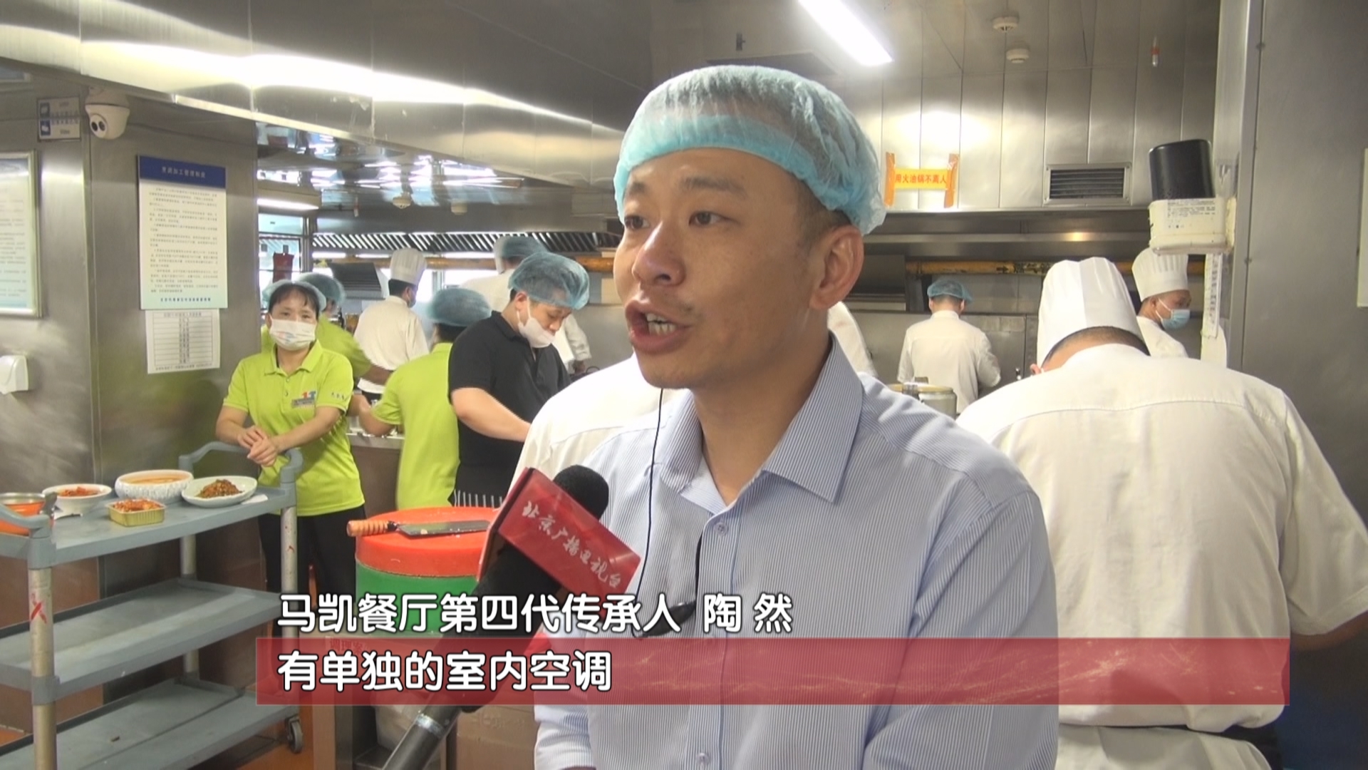 马凯餐厅第四代传承人陶然:我们在装修之初 就对厨房排烟的风速和风量进行了测试 包括烟气 也没有老的厨房烟气那么大了 除了中央空调之外 像咱们的凉菜间 有单独的室内空调 常年温度保持在25度以下