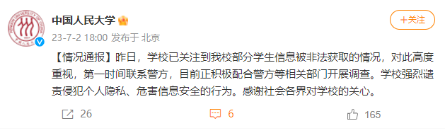 2023年7月2日,@中国人民大学发布情况通报,全文如下——