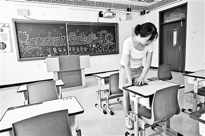黑山小学老师在新教室内摆放、擦拭桌椅 摄影/本报记者 杨益