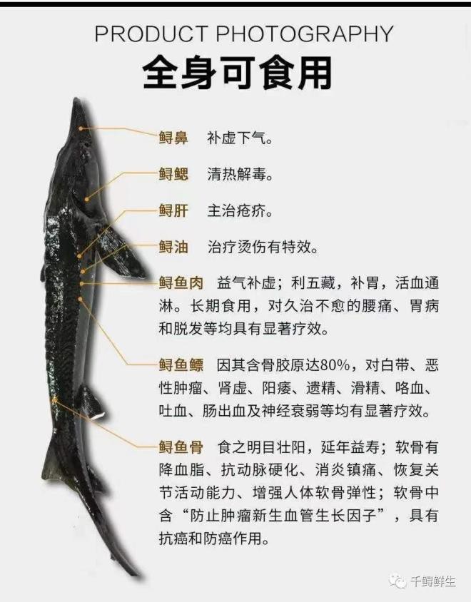 《本草纲目·鳇鱼》引述陈藏器语云:“其肝主治恶疮疥癣,勿以盐炙食。”又在“鲟鱼”条下引述云:“其肉补虑益气,强身健体,煮汁饮,治血淋;其鼻肉作脯补虑下气;其籽如小豆,食之健美,杀腹内小虫。”鲟鱼肉蛋白质含量高(16.7-19.9 g/100g),肌肉中含有十多种人体必需的氨基酸,是优质蛋白质来源。同时,它又富含不饱和脂肪酸,含有俗称脑黄金的DHA,可以促进大脑发育,改善记忆,还有预防心脑血管的功效等。更重要的是,鲟鱼全身没有硬刺,除了头顶的膜骨和体表的五行骨板是硬骨,其余都是可以食用的软骨,对于儿童和老人来说是非常好的食品。