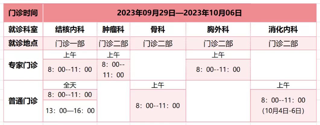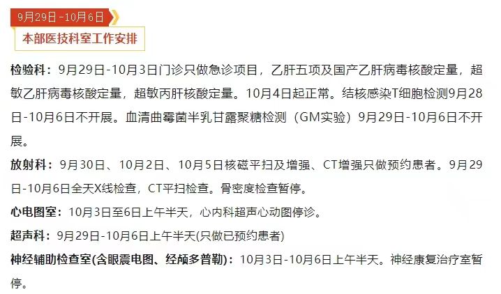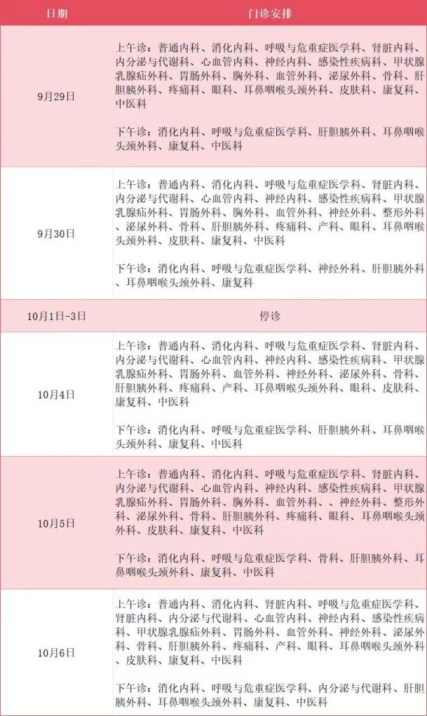 内分泌科、呼吸科、肿瘤介入科:9月29日—10月2日停诊;10月3日—6日上午普通门诊。