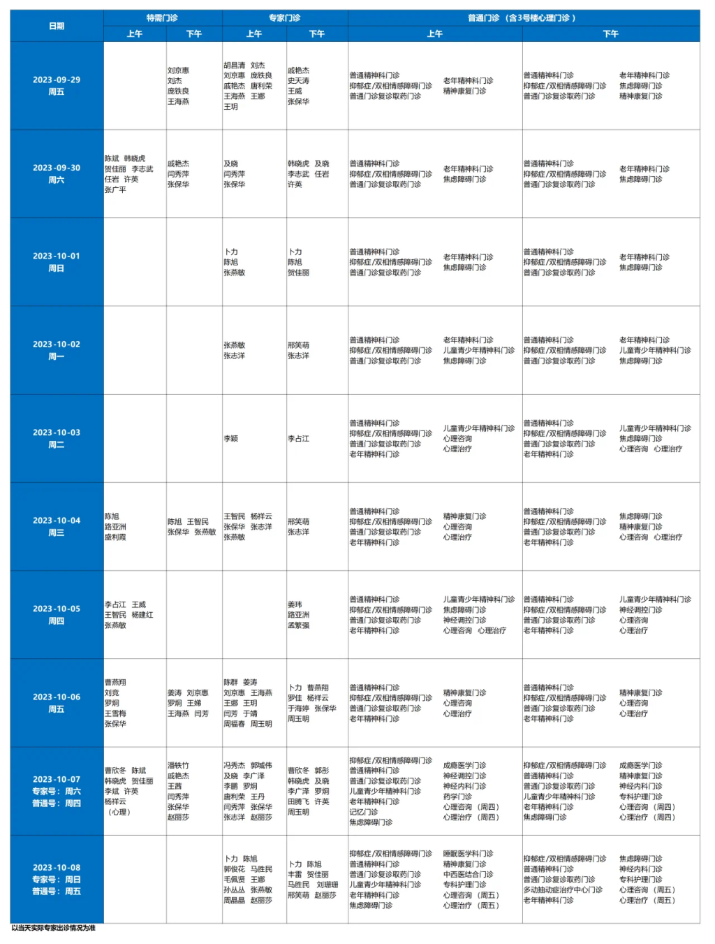 9月29日至10月2日:专家门诊自然停诊,专业门诊按周日安排;