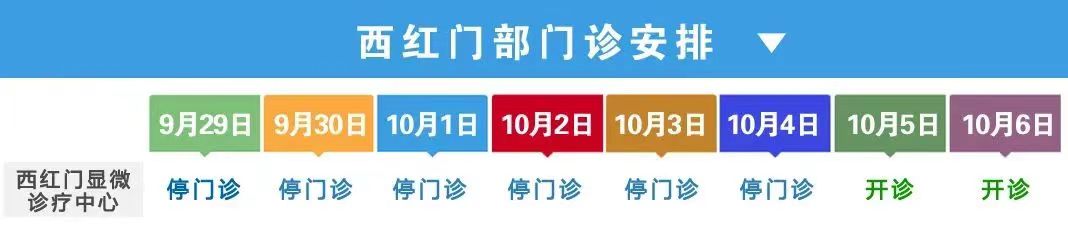 妇科:9月29日—10月2日、4日停诊;10月3日、5日、6日全天专家门诊。