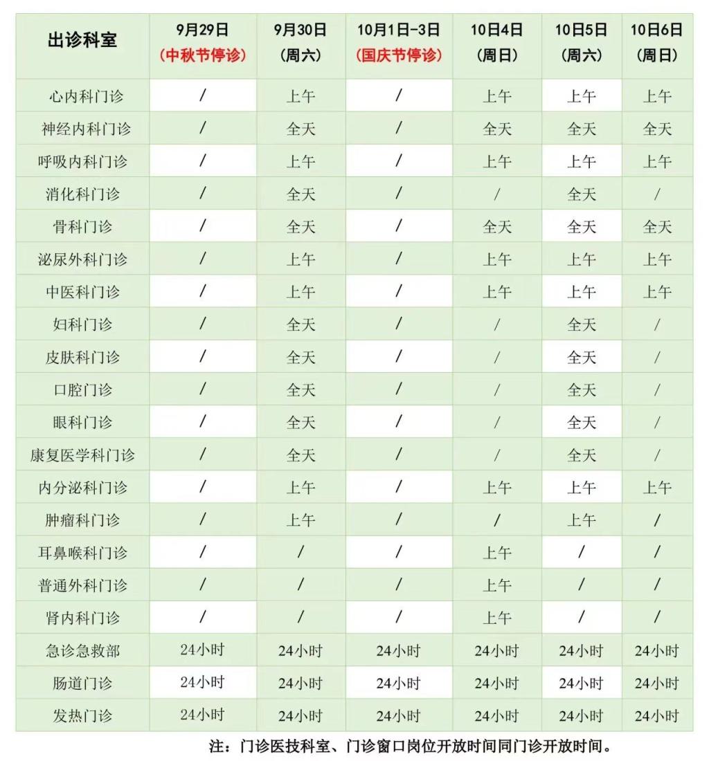 心内科、神经内科:9月29日—10月2日停诊;10月3日—6日上午专家门诊。