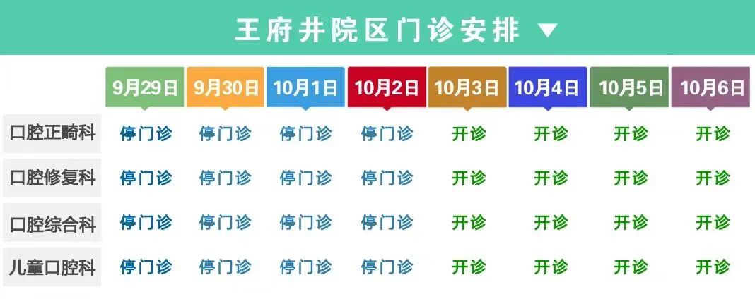 口腔科:9月29日全天普通门诊、10月2日全天普通门诊。
