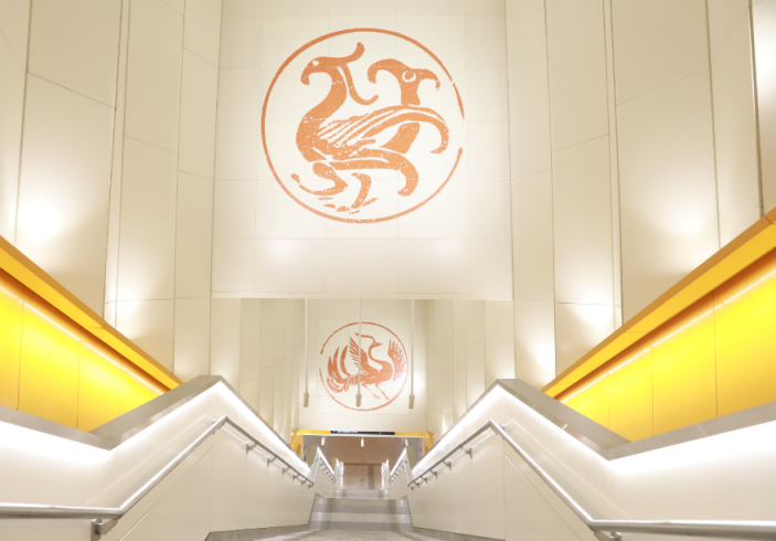 16号线剩余段则延续全线“京廊古韵”主题,宛平站设置了艺术品站,壁画采用折面设计,将两幅画面融二为一,一幅画是对卢沟晓月、宛平城墙及卢沟桥上千姿百态的石狮子进行二次创作,另一幅画则是结合红色基地精神思想,将旗帜、灯笼等红色印象融入其中,表达了对伟大抗战历史的铭记和新时代对中华民族不屈不挠伟大精神的创造性转化和创新性发展。
