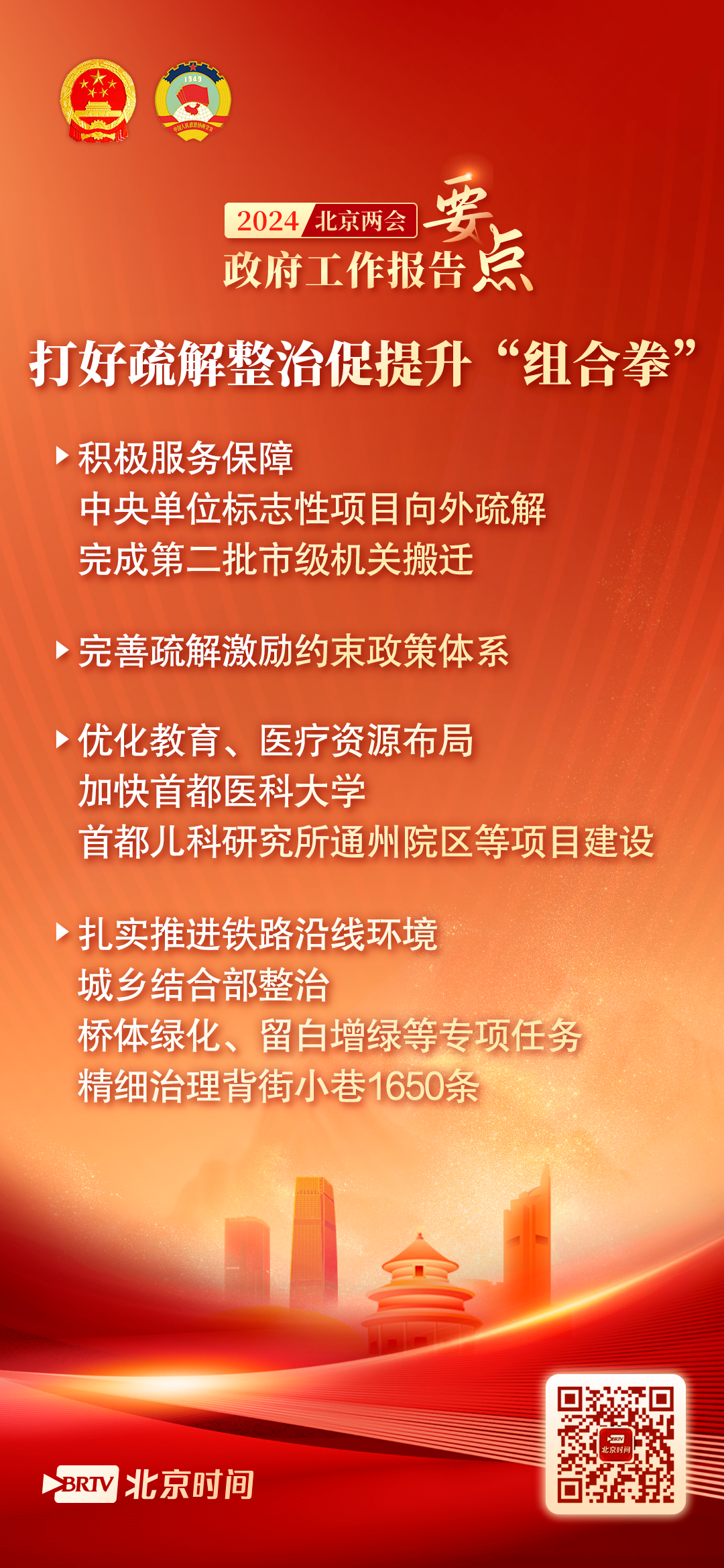 打好疏解整治促提升“组合拳”。积极服务保障中央单位标志性项目向外疏解,完成第二批市级机关搬迁。完善疏解激励约束政策体系,实现城乡建设用地再减量6.5平方公里,确保新生违法建设动态清零。优化教育、医疗资源布局,加快首都医科大学、首都儿科研究所通州院区等项目建设。扎实推进铁路沿线环境、城乡结合部整治和桥体绿化、留白增绿等专项任务,精细治理背街小巷1650条,推进大红门等区域功能重塑和品质提升。