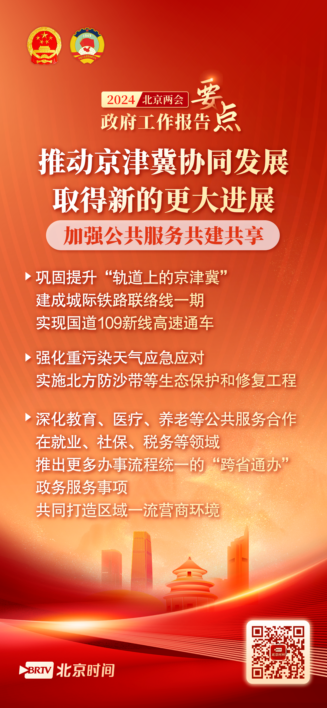 加强公共服务共建共享。巩固提升“轨道上的京津冀”,建成城际铁路联络线一期,实现国道109新线高速通车。强化重污染天气应急应对,实施北方防沙带等生态保护和修复工程。深化教育、医疗、养老等公共服务合作,在就业、社保、税务等领域推出更多办事流程统一的“跨省通办”政务服务事项,共同打造区域一流营商环境。