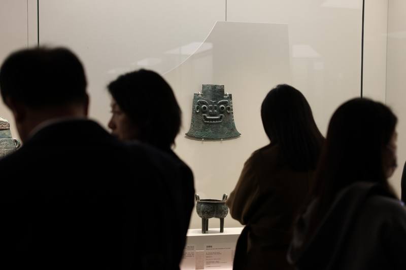 2023年10月24日,清华大学艺术博物馆,观众在看展,中间为国家一级文物、山东省博物馆藏商代亚醜钺。 新京报记者 浦峰 摄