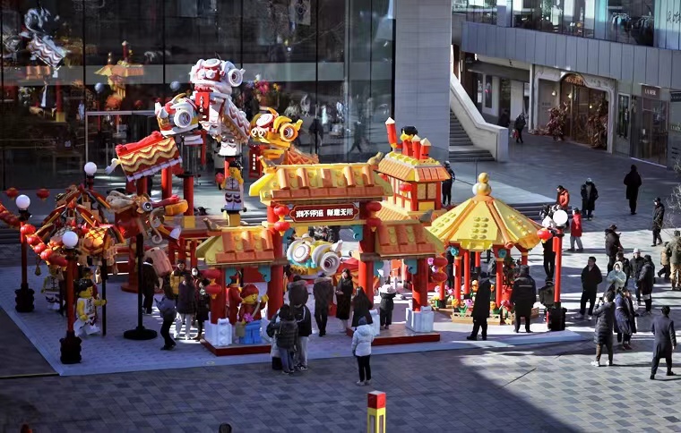 1月24日,天气晴好,气温回暖,市民在北京三里屯太古里逛街。春节临近,太古里商圈换上了喜庆的新春装饰,拼搭起舞龙舞狮表演、新春牌坊,新春氛围拉满。