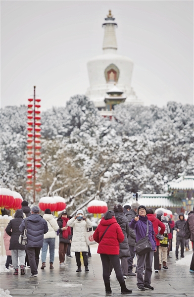 2月21日,北海公园,游客在雪景中游玩。新京报记者 薛珺 摄