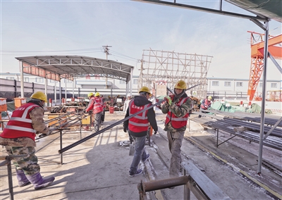2月22日,平谷线永顺站,工人正在搬运钢材。新京报记者 陶冉 摄