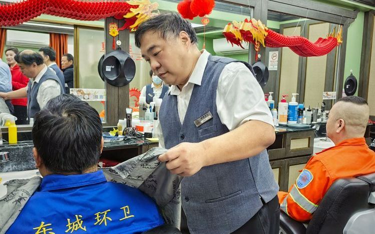 8点半,几名大红门街道的环卫工人陆陆续续来店里理发,鲜亮的工作服都没来得及脱。“我们早班4点就开始了,正好趁着休息时间来理发。”一位环卫工说,每年二月二都会来理发,希望能讨个好彩头。