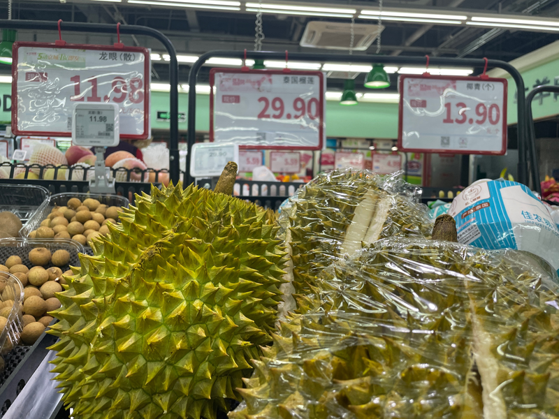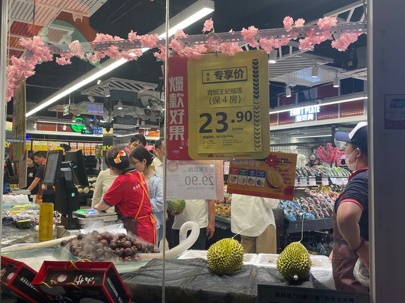 5月份,泰国东部的金枕榴莲进入集中成熟期,一登陆北京市场,便抢占了这一季商超菜店果蔬区的“C位”。“榴莲季”刚拉开序幕,就成了当季果品中的“顶流”,“价格一天一个样”“一斤跌破10元”等消息也频登热搜。近日,新京报记者探访多个线下门店,看到榴莲每斤单价集中在20元-30元,当前,百元价位的榴莲仍是市场主流。