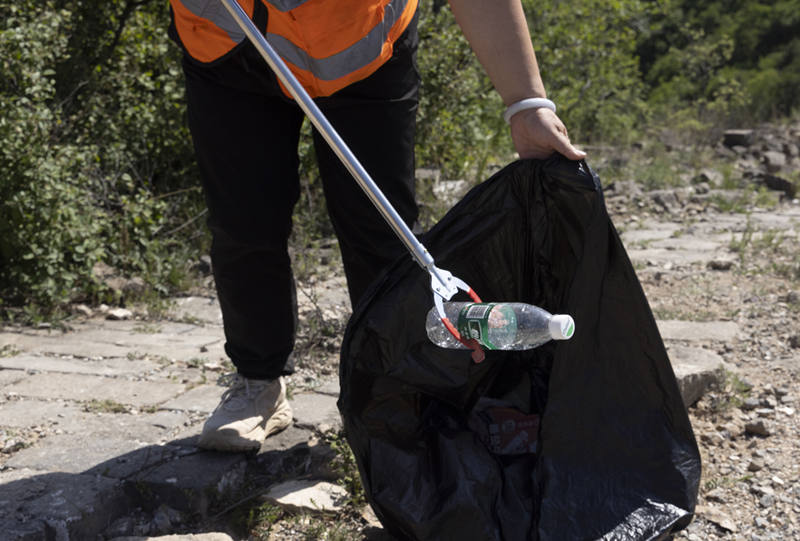 5月17日,梅兰芬将丢弃在长城上的垃圾装进随身携带的垃圾袋中。