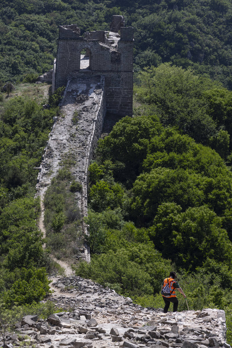 5月17日,八达岭镇石峡村,梅兰芬在巡护途中检查长城上是否有丢弃的垃圾。