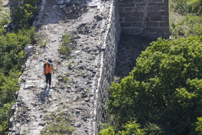 5月17日,长城保护员梅兰芬检查地面上是否有垃圾,并进行砖面检查。