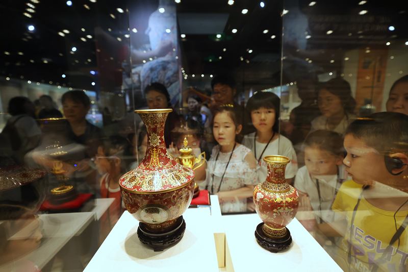 7月6日晚,北京市珐琅厂“第六届梦幻景泰蓝夜场文化体验季”活动拉开帷幕。小朋友参观景泰蓝艺术博物馆。新京报记者 王贵彬 摄