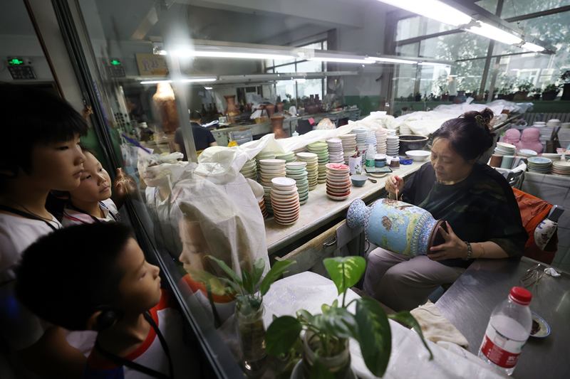 小朋友参观景泰蓝点蓝制作工艺。新京报记者 王贵彬 摄