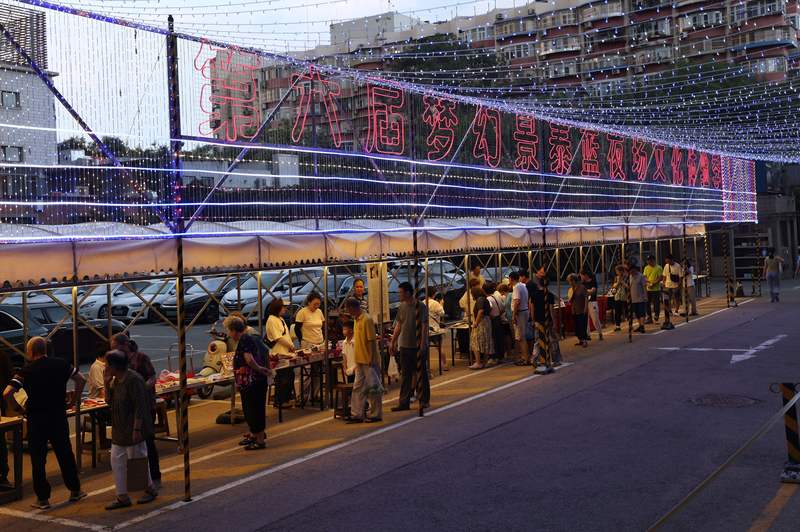 今年市集新增了“梦幻景泰蓝嬉戏游”,吸引了不少市民带着小朋友参与,大家通过“不’漆’而遇”漆扇体验和“意气相’投’”投壶游戏等活动,在夜间感受非遗文化的魅力。漆扇体验中,孩子们将扇子匀速置于色漆之中,旋转摇摆间,白色扇面将流动的色彩定格,如开盲盒一般让孩子们惊喜连连。投壶游戏区,每人发五支箭,参与者调整投掷的角度和力度,若是投中,现场便传来一阵喝彩。市民张先生带着孩子玩得不亦乐乎:“以前只在电视中看过投壶,觉得很简单,但实际操作起来还是挺难的。”
