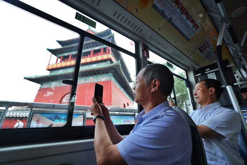 5路公交车上,乘客们掏出手机拍摄鼓楼。新京报记者 王贵彬 摄