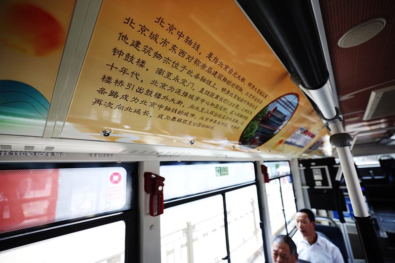 在5路公交车内有关于北京中轴线的历史文化介绍。新京报记者 王贵彬 摄