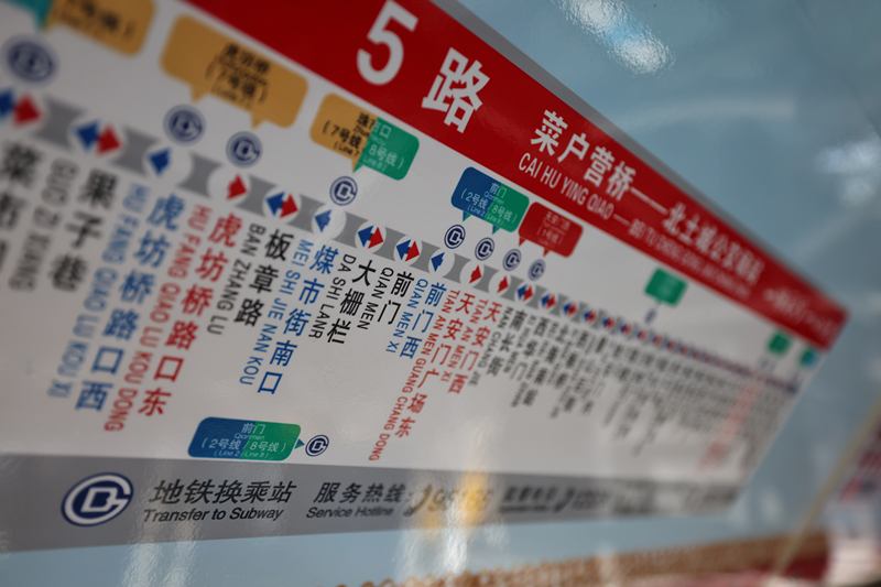 7月29日上午,记者乘坐5路公交车从二环西南角的菜户营桥公交场站出发,经大观园沿护城河一路北行至广安门,而后向东沿广安门内大街、珠市口西大街前行。转入前门东路后,车窗外的街景渐渐变得热闹起来,车内乘客也越来越多。