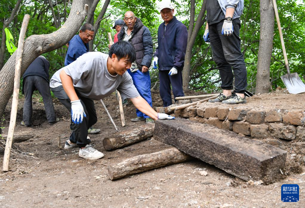 在箭扣长城120号敌台考古现场,工人们利用撬棍、滚木运输一块挖出的条石(7月2日摄)。