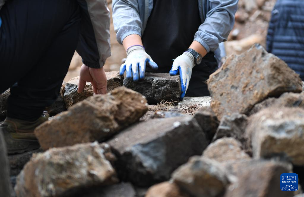 工人在整理从箭扣长城120号敌台考古现场挖出的砖块(7月2日摄)。