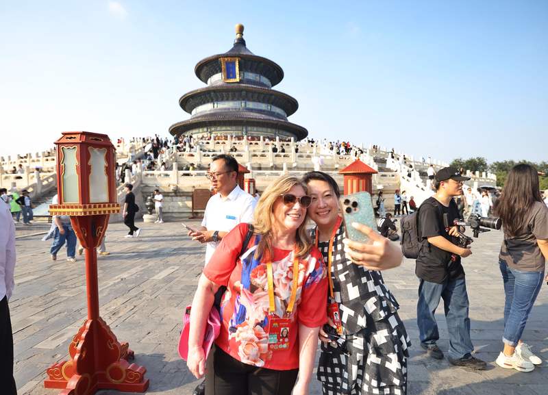 9月19日下午,外国学者在天坛前合影。新京报记者 王贵彬 摄