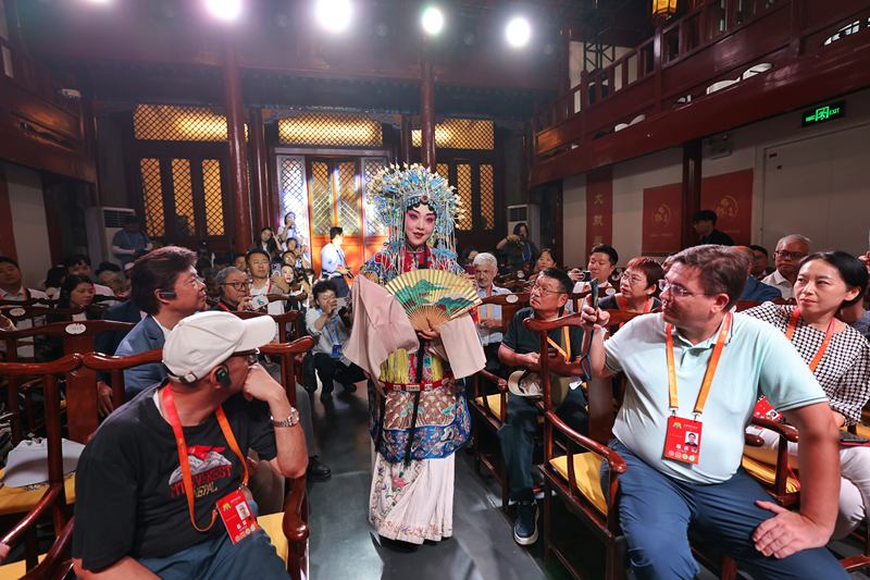 9月19日下午,位于青云胡同与北芦草园胡同交界处的颜料会馆里,响起了婉转悠扬的音乐,舞着水袖的京剧演员款款步入舞台中央,观众席上的学者纷纷举起手机拍照。“太美了。”来自肯尼亚的公共卫生专家皮特忍不住竖起大拇指,连声赞叹。