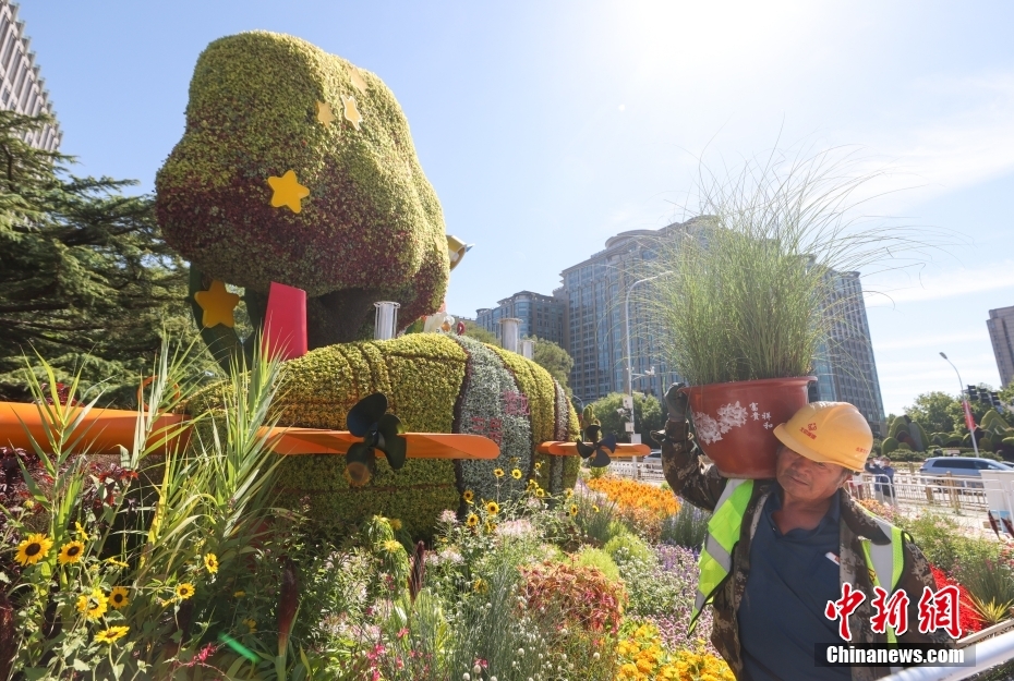 9月22日,北京东单路口东北角的花坛正在搭建中,工人对花卉摆放位置做调整。中新社记者 贾天勇 摄