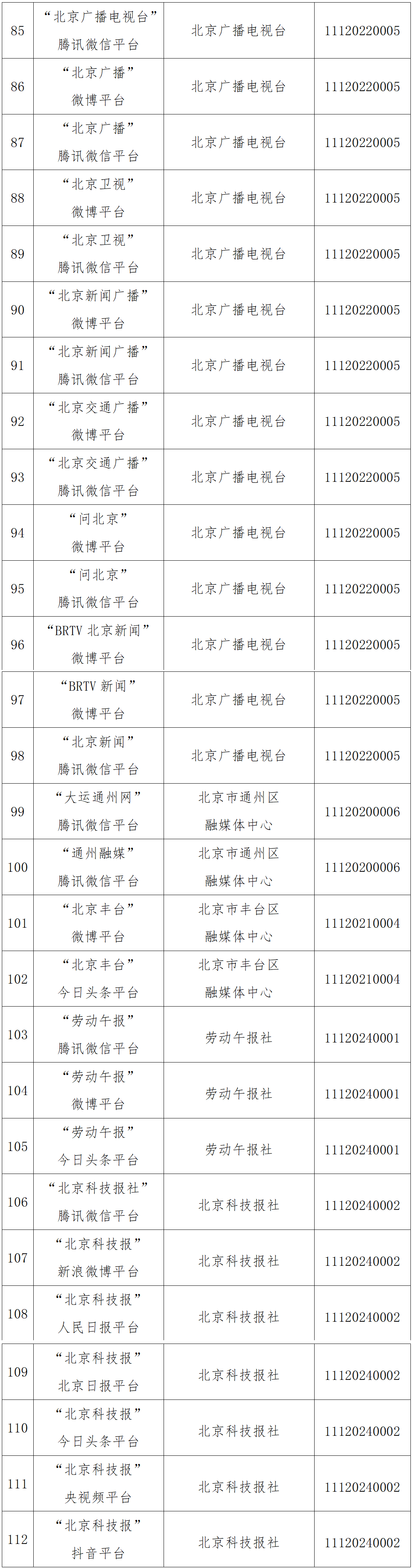 截至2024年9月27日,由北京市互联网信息办公室批准的互联网新闻信息服务单位共30家,分别是:北京日报社、北京青年报网际传播技术有限公司、北京千龙新闻网络传播有限责任公司、中共北京市委前线杂志社、新京报社、北京青年报社、北京广播电视台、北京广播集团有限公司、北京新媒体(集团)有限公司、北京商报社有限公司、京报移动传媒有限公司、北京市海淀区融媒体中心、北京市昌平区融媒体中心、北京市门头沟区融媒体中心、北京市朝阳区融媒体中心、北京市通州区融媒体中心、北京市密云区融媒体中心、北京市怀柔区融媒体中心、北京市大兴区融媒体中心、北京市延庆区融媒体中心、北京市平谷区融媒体中心、北京市石景山区融媒体中心、北京市房山区融媒体中心、北京市丰台区融媒体中心、北京市顺义区融媒体中心、尚亦城(北京)科技文化集团有限公司(北京经济技术开发区融媒体中心)、北京市东城区融媒体中心、北京市西城区融媒体中心、劳动午报社、北京科技报社,均获得采编发布服务许可。具体服务形式包括:互联网站18个,应用程序25个,公众账号112个,共155个服务项。