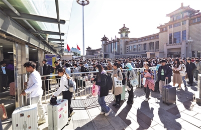 10月7日,北京站出站旅客排队乘坐地铁。新京报记者 王贵彬 摄