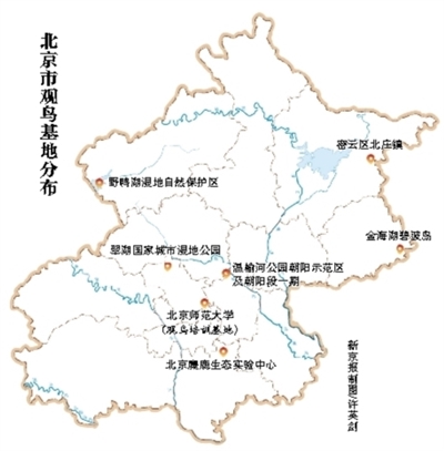 为了给市民提供更加专业、便捷的观鸟服务,北京市园林绿化局推出了首批观鸟基地及首个观鸟培训基地。其中,“北京市翠湖国家城市湿地公园”是国务院批准的第二批国家级城市湿地公园;大兴区南海子的“北京麋鹿生态实验中心”是国内第一家以散养方式为主的麋鹿自然保护区,也是鸟类爱好者的观鸟胜地;密云区的北庄镇已连续两年举办“北庄镇观鸟经济沙龙”;北京温榆河公园朝阳示范区及朝阳段一期是重要的生态廊道和动物迁徙通道,建园以来迅速吸引了众多鸟类停歇。