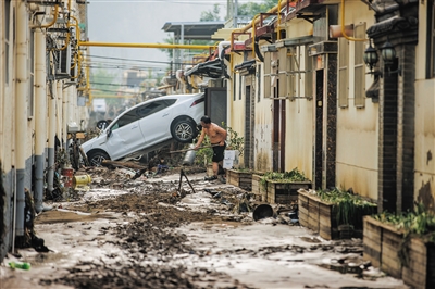 2023年8月2日,门头沟水峪嘴村,村民在清理淤泥。