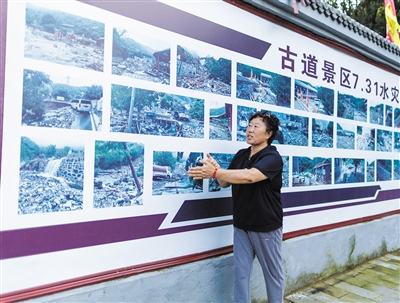 古道外的一面洪水纪实墙上,贴满了照片。水峪嘴村宣传委员付宏春介绍,这是去年洪水后,村里人用拍摄于洪水时期的照片做的纪实墙,一共做了两面,另一面在村委会外墙处。每面纪实墙用几百张照片,记录着水峪嘴村抗洪救灾以及灾后重建的过程。